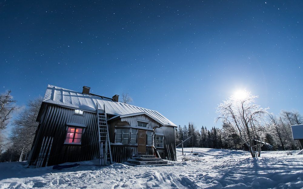 Myöhemmin illalla puolikuu nousi valaisemaan pihapiiriä, eikä auttanut muu kuin iskeä jälleen jalusta hankeen. Talon yllä leijunut Otava taipui juuri ja juuri mukaan kuvaan.