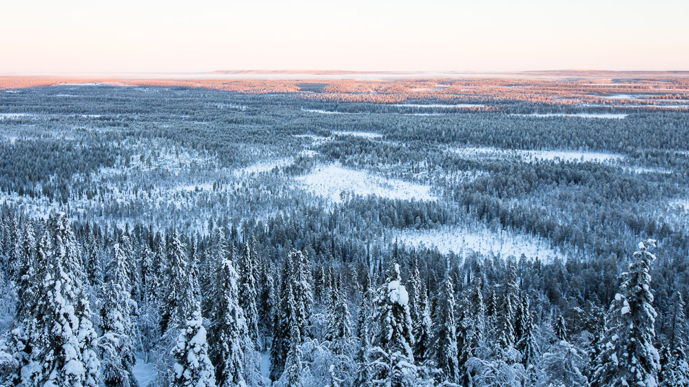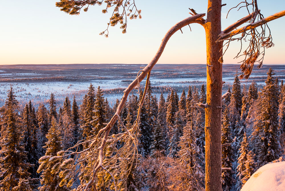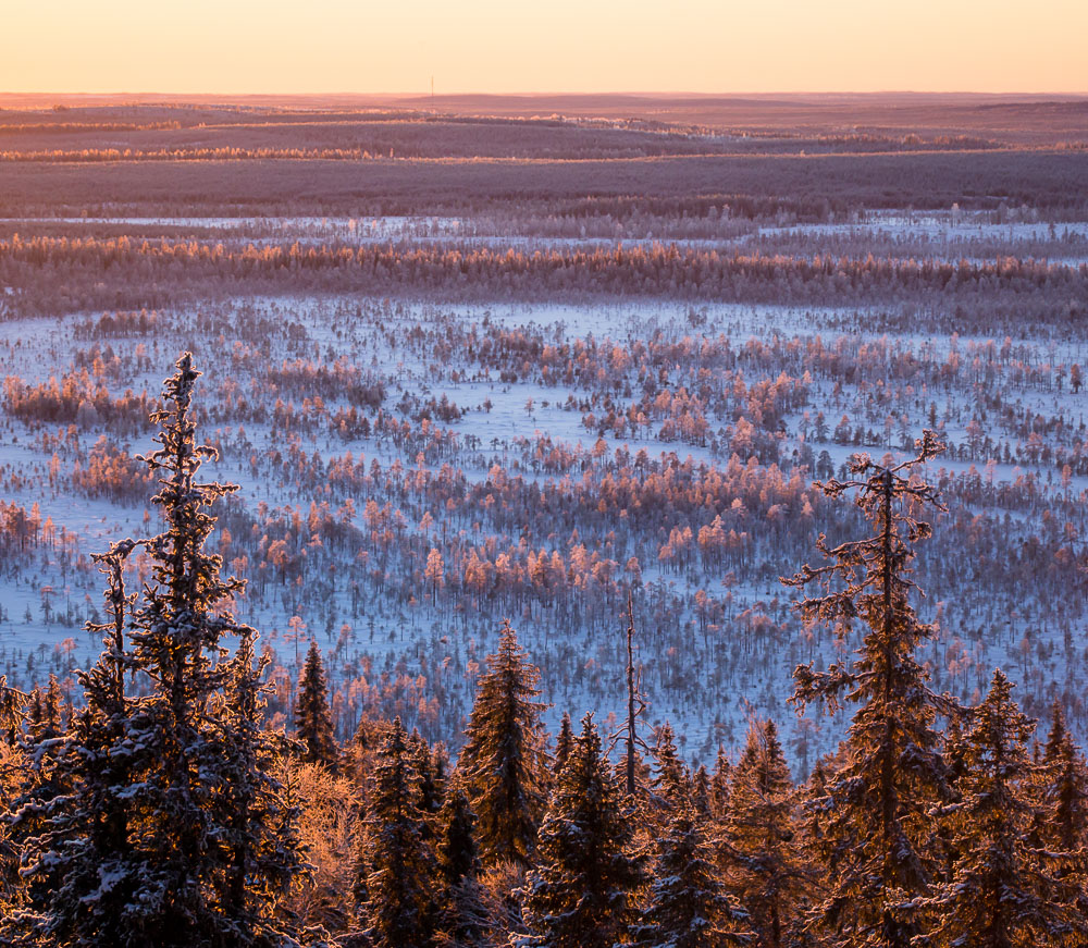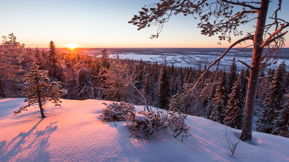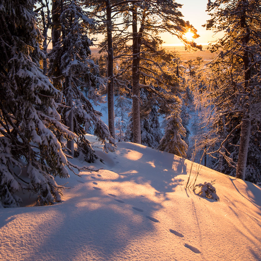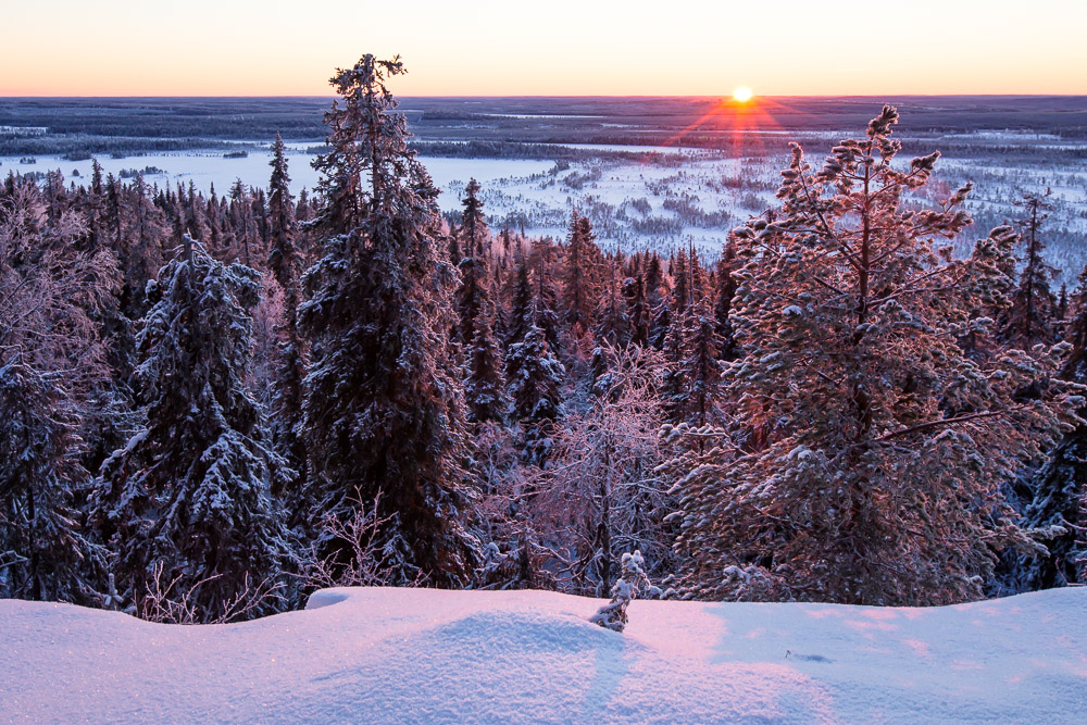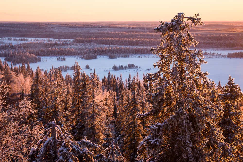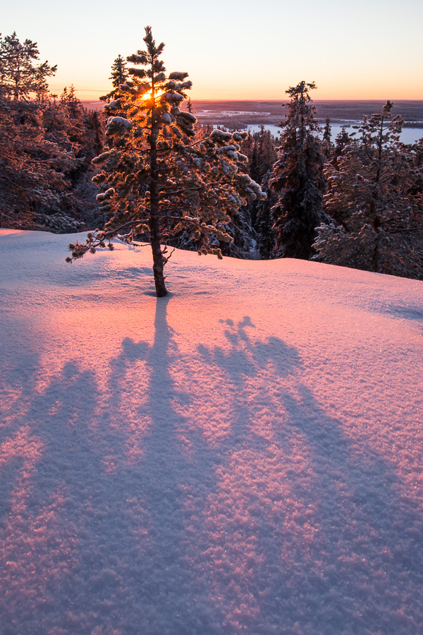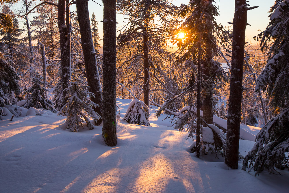 Vuoden viimeisinä päivinä aurinko nousee Kuusamossa noin puoli yhdeltätoista. Silloin se on jo lähellä eteläsuuntaa, joten kuvauspaikaksi valikoitui Yhdeksänsylenkallio. Aamutoimissa kesti kauan ja vaaralle kipuaminen vei oman aikansa. Aurinko kultasi jo kynttiläkuusia ehtiessäni paikalle. Onneksi kaamosaurinko kulkee loivaa rataa, eikä peli ole menetetty hetkessä. Upeaa valoa riittää koko kolmen tunnin ajaksi, jonka aurinko killuu horisontin yllä.