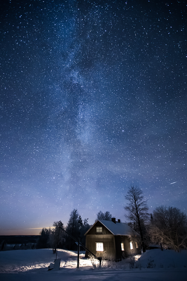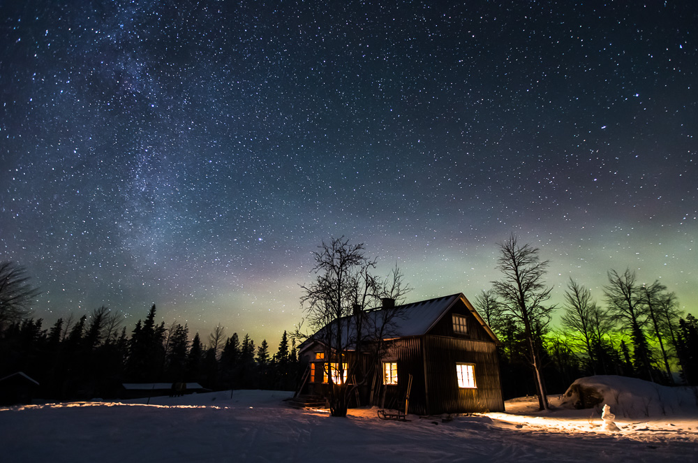 Hurjaa spektaakkelia ei syntynyt, mutta staattinen revontulimössö asettui pitkäksi aikaa sekä pohjoiselle että eteläiselle taivaalle. Kiersin jalustan kanssa taloa kuin kissa kuumaa puuroa ja yritin etsiä täydellistä kuvakulmaa. Ikkunasta kajastava valo tarjosi mukavan lisäelementin, ja illan onnistunein kuva syntyi pääovien edestä: