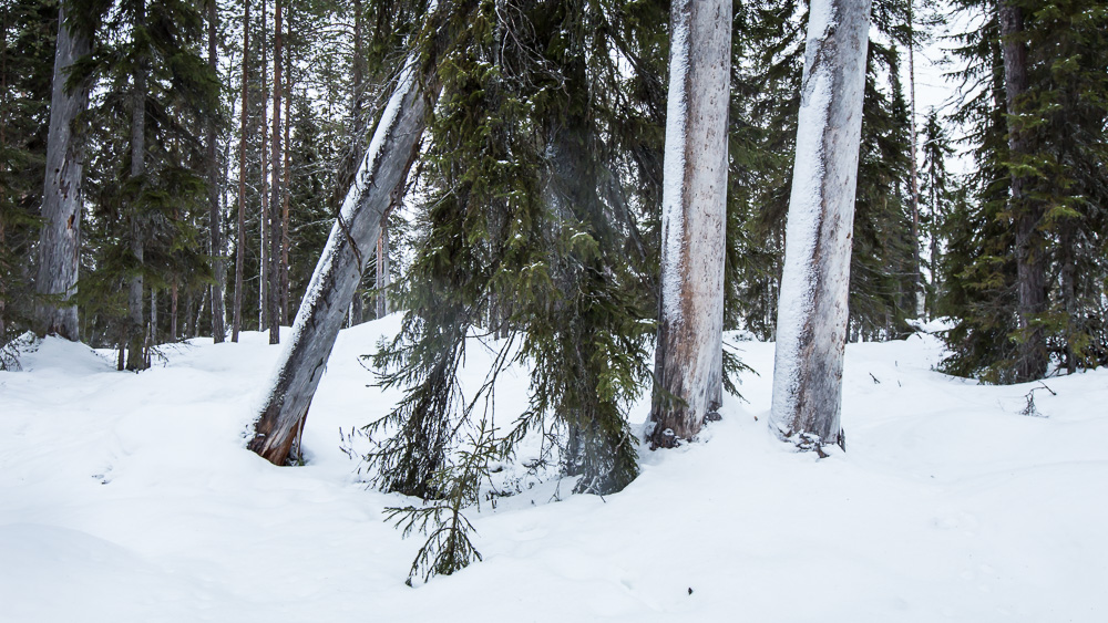 Huiman kuvauspäivän jälkeen sää pilvistyi ja lauhtui kymmeneen pakkasasteeseen. Kameraa ei enää tarvinnut käyttää yhtä mielipuolisesti, vaan saatoin keskittyä hiihtämisestä nauttimiseen. Ja kyllähän suksilla liikkuminen maistui vuoden tauon jälkeen! Ennen joulua Kuusamossa oli ollut lauha jakso, jonka ansiosta hangen pinnan alta paljastui kantava kerros. Kuin keväthangilla olisi hiihdellyt.