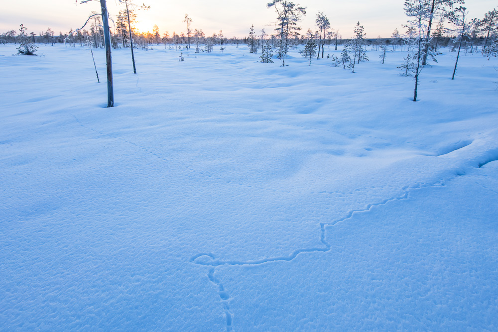 Aamulla sää jatkui kirkkaana ja pakkanen oli kiristynyt takaisin tulopäivän lukemiin, -23 asteeseen. Puolikuu keikkui vielä vaaramaiseman yllä nostellessani rinkkaa selkään. Vaaran juurella aurinko nousi kultaamaan huurteisen suomaiseman. Hyöteikönsuon hanki oli täynnä eläinten jälkiä: pikkujyrsijöitä, jäniksiä, näätä, ahma ja lopulta vielä susi. Kuusamon syrjäseutu voi vaikuttaa ensi silmäyksellä autiolta, mutta jäljistä päätellen emme olleet läheskään ainoat talvisesta luonnosta nautiskelleet.