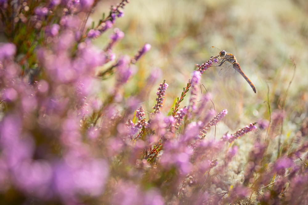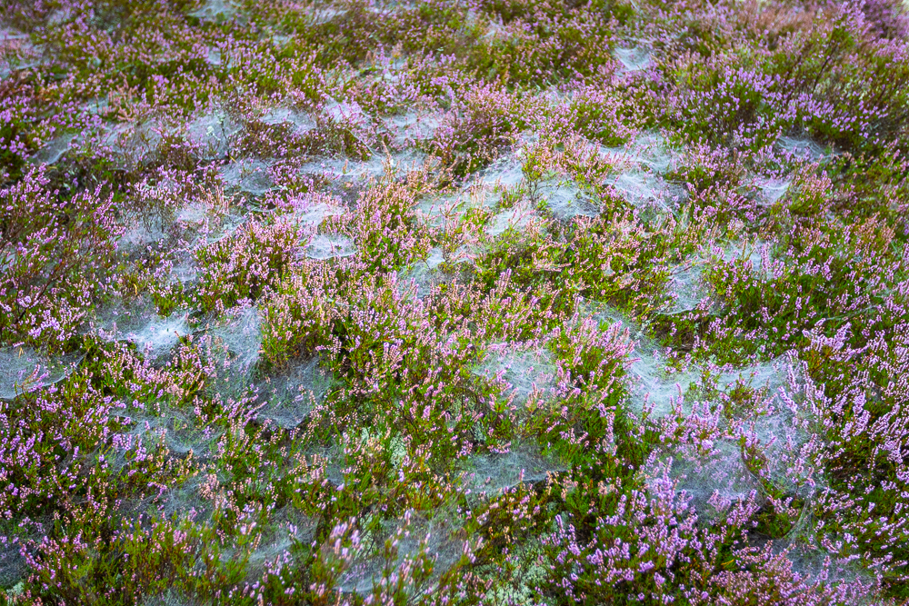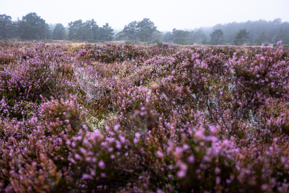 Heräilin kuuden jälkeen ja lojuin hetken teltassa odottamassa aamun valkenemista. Hernerokkasumu muodosti saarelle niin paksun peiton, etten nähnyt tarpeelliseksi lähteä toikkaroimaan ulos ennen kuin hieman valoistuisi. Vähän ennen seitsemää nakkasin kamerarepun selkään ja lähdin kuvaamaan sumuista kanervanummea, joka hehkui vaaleanpunaisena ja oli koristeltu tuhansilla hämähäkinseiteillä.