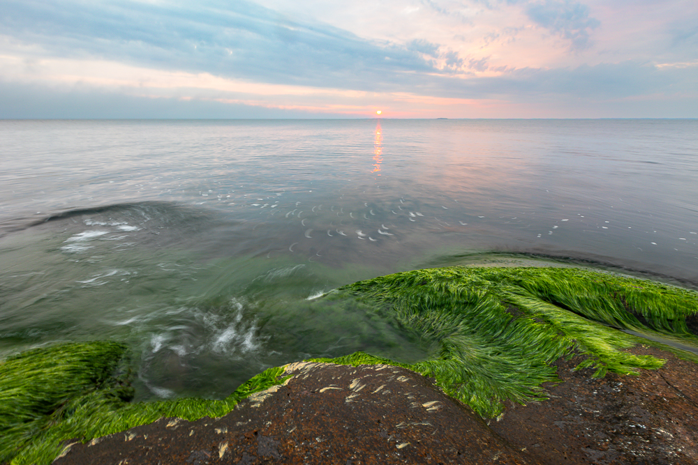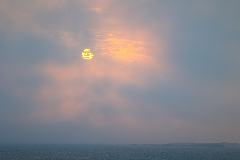 Päivällisen jälkeen jatkoimme matkaa kävellen saaren eteläkärkeen. Melkein täyden Kuun piti nousta klo 20 jälkeen ja sitä ennen ehtisi kuvata auringonlaskun. Hyvällä tuurilla samaan ruutuun Kuun kanssa saattaisi saada jopa Bengtskärin majakan, jonka tasalle Kuu yltäisi noin puoli tuntia nousun jälkeen. Suunnitelman tielle asettui vain yksi este: sumu oli jälleen noussut Örön saariston ylle.