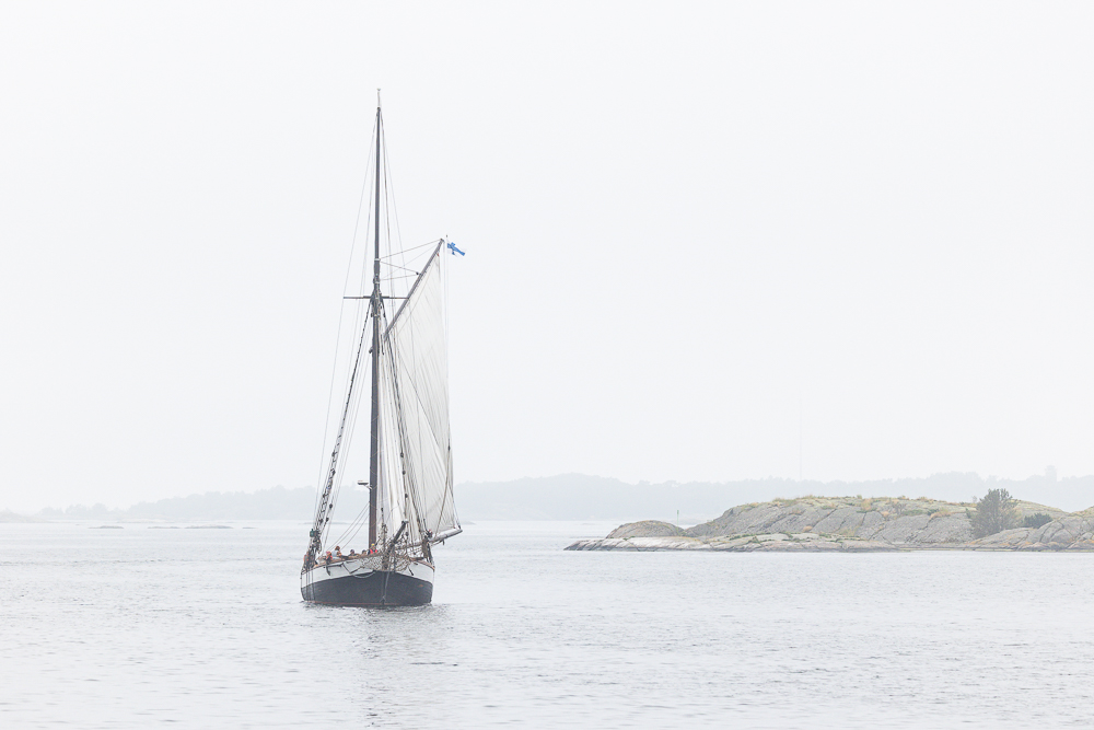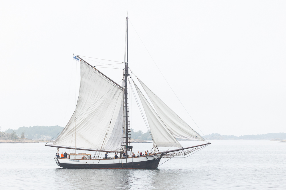 Teltan purkamisen ja ravintolassa nautitun buffet-lounaan jälkeen oli aika hyvästellä Örö ja siirtyä merimatkalle kohti Kasnäsiä. Kemiönsaaren oma perinnealus, puinen purjelaiva Eugenia, lähti hetkeä aiemmin laiturista. Myöhemmin ohitimme purjeet komeasti nostettuina seilaavan aluksen. Pääsin itsekin tänä kesänä Eugenian kyytiin parin tunnin risteilyllä, harmillisen tyynenä päivänä purjeilla ei tosin päästy etenemään kuin lyhyen aikaa.