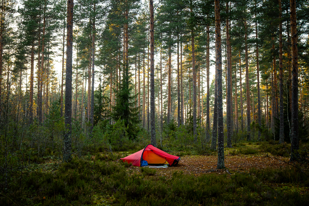 Itse lähdin matkaan Bonfus Middus 2P:llä, jota käytän puolikkaan sisäteltan kanssa yhden hengen majoitteena. Se on parhaimmillaan alkukesäisessä avotunturissa, kun hyttysistä ei ole riesaa ja teltalta vaaditaan tuulenkestoa ja hyviä eteistiloja. Sen sijaan syksyisessä metsässä teltta olisi voinut toimia jopa paremmin pelkkänä tarppina, sillä tuplamakuualustan ja talvimakuupussin kanssa sisäteltta kävi ahtaaksi ja keräsi tyynenä yönä reilusti kondenssivettä.